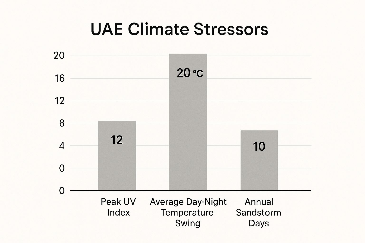 - Intense UV Radiation: The UAE regularly sees some of the highest UV index levels in the world, often hitting an extreme 11+ in summer. This constant solar bombardment literally shatters the polymer chains in standard sealants, making them brittle, chalky, and inflexible.